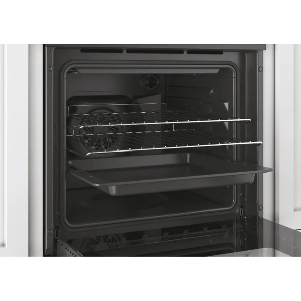 Elettrico, Ventilato, 65 litri, Nero, 2 Manopole e un orologio , 8 Funzioni, Ventola di raffreddamento esterno tangenziale, 2 griglie, 1 leccarda. Classe energetica A+ Dimensioni del prodotto (mm) 595x595x568 Dimensioni del vano per l'installazione (mm) H580xW560xD550